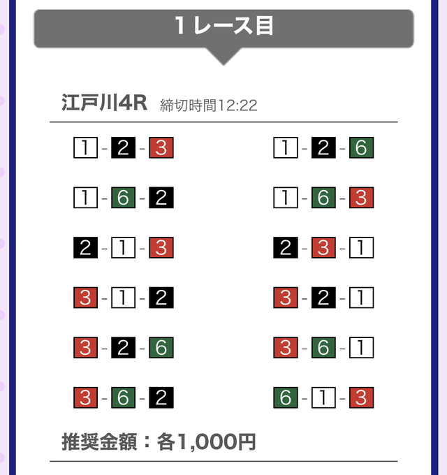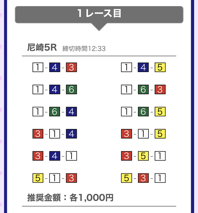 | 8月18日 | 三国10R | 三連単 | 12点 | 34,600円 |