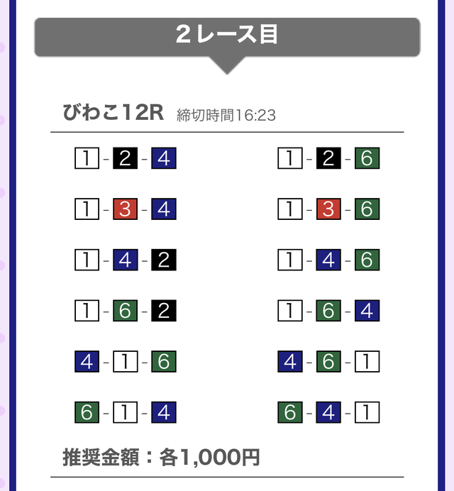 | 1月26日 | びわこ12R | 三連単 | 12点 | 19,800円 |