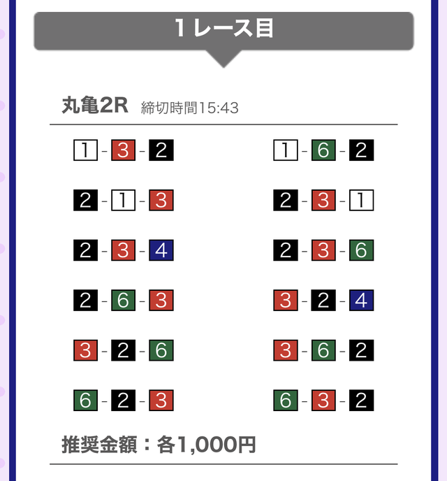 | 2月2日 | 丸亀2R | 三連単 | 12点 | 32,100円 |