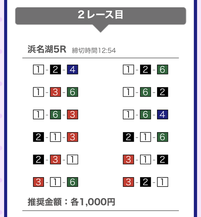 | 2月3日 | 浜名湖5R | 三連単 | 12点 | 28,100円 |