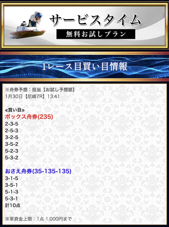 買い目を見ると、1号艇を軸に完全固定し、2着以下には2号艇と6号艇を配置した予想。