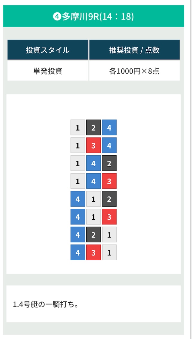 | 10月29日 | 多摩川9R | 三連単 | 8点 | 13,300円 |