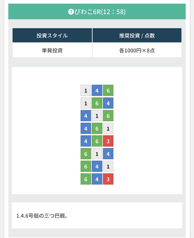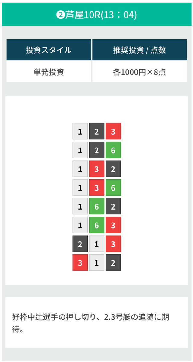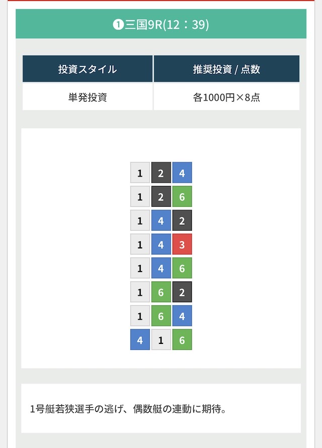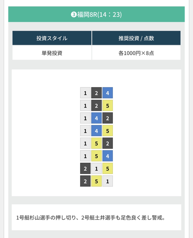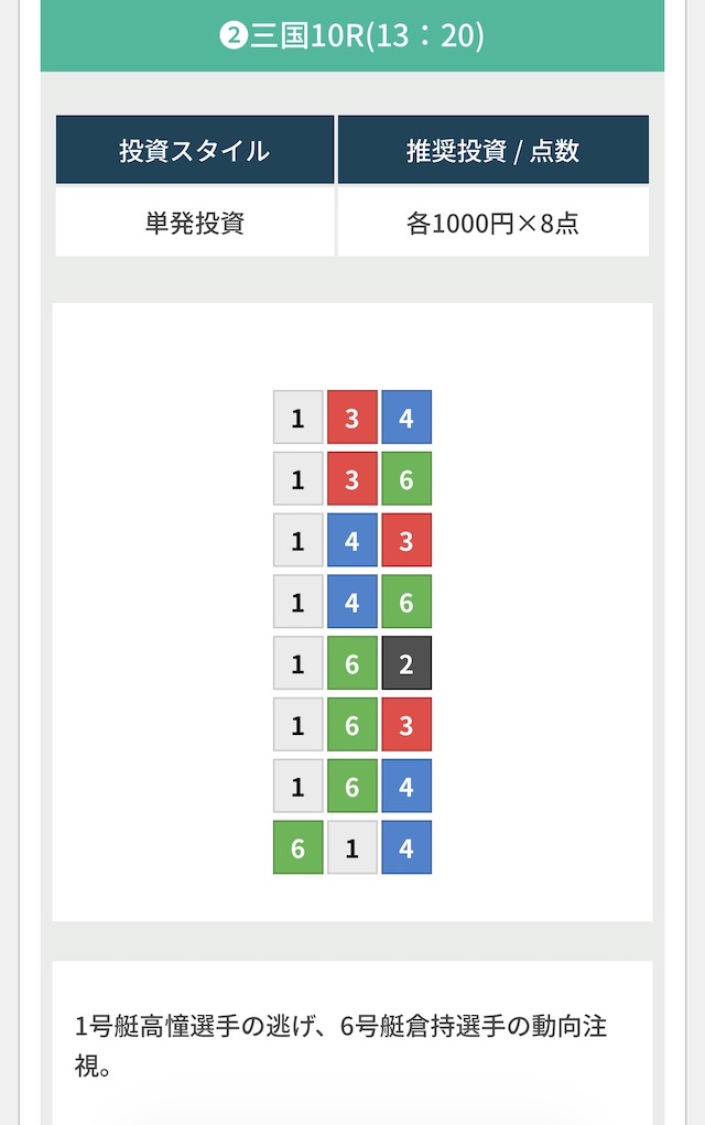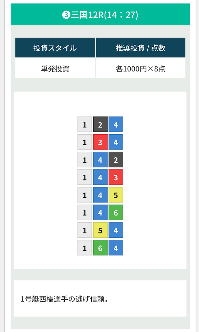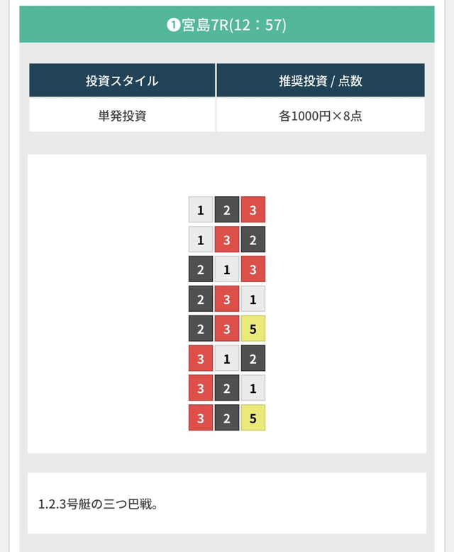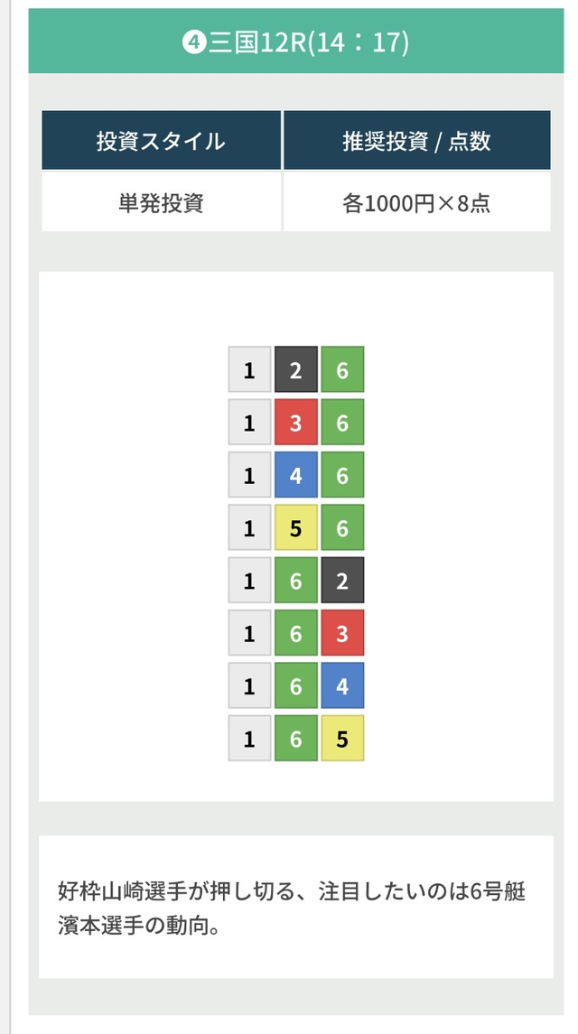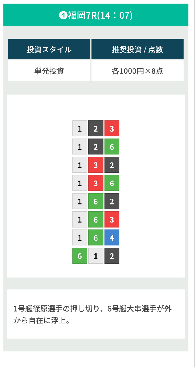 | 10月7日 | 三国12R | 三連単 | 8点 | 8,900円 |