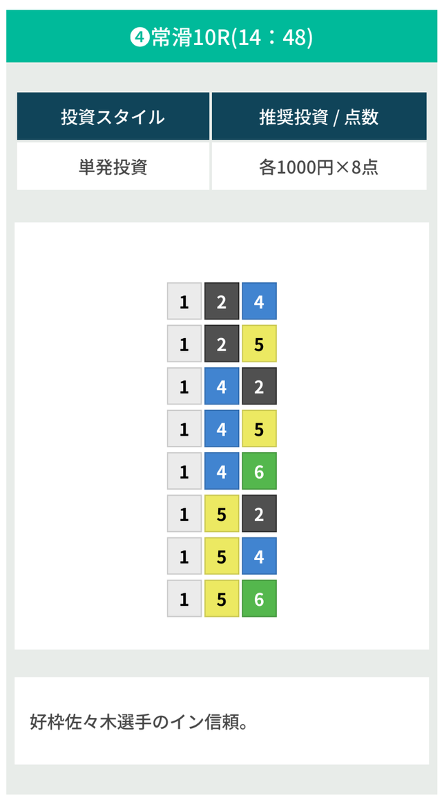 | 10月12日 | 常滑6R | 三連単 | 8点 | 35,300円 |