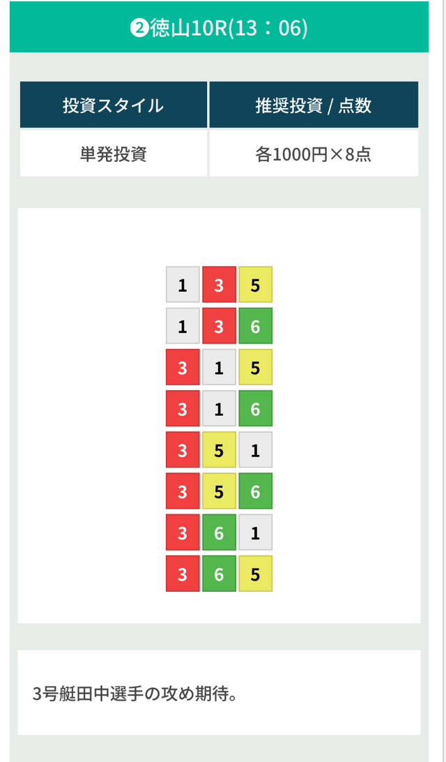 | 10月9日 | 徳山11R | 三連単 | 8点 | 8,700円 |