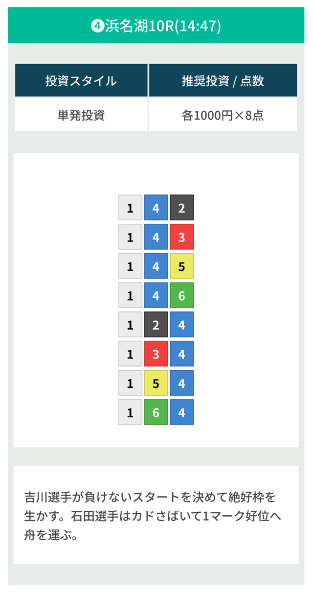 | 11月27日 | 浜名湖10R | 三連単 | 8点 | 10,000円 |