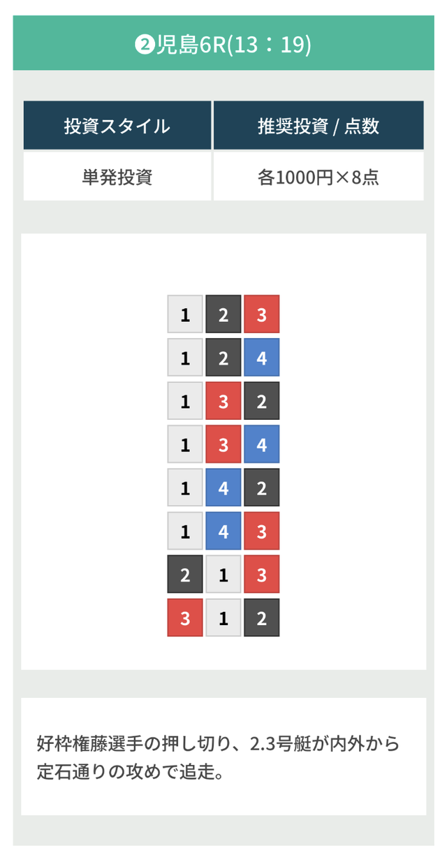 | 11月12日 | 三国12R | 三連単 | 8点 | 25,200円 |