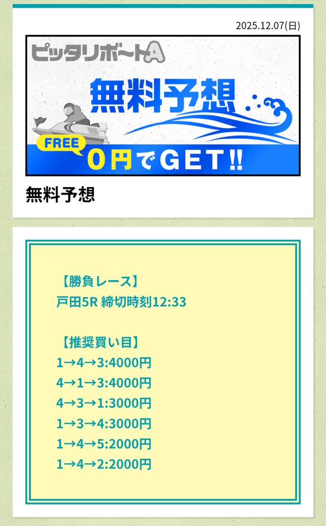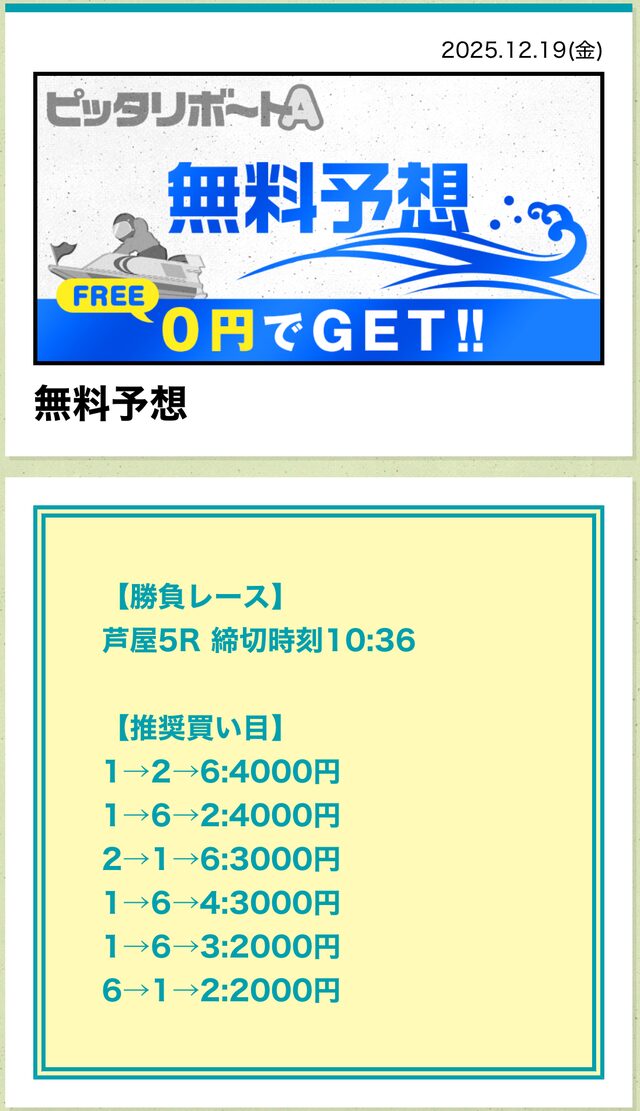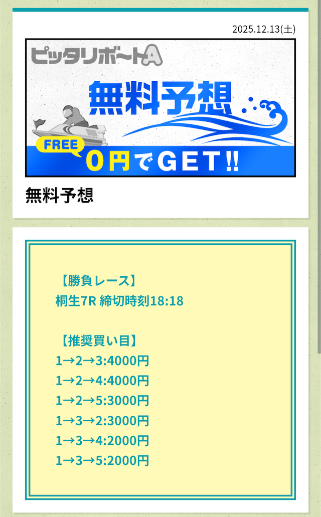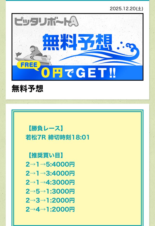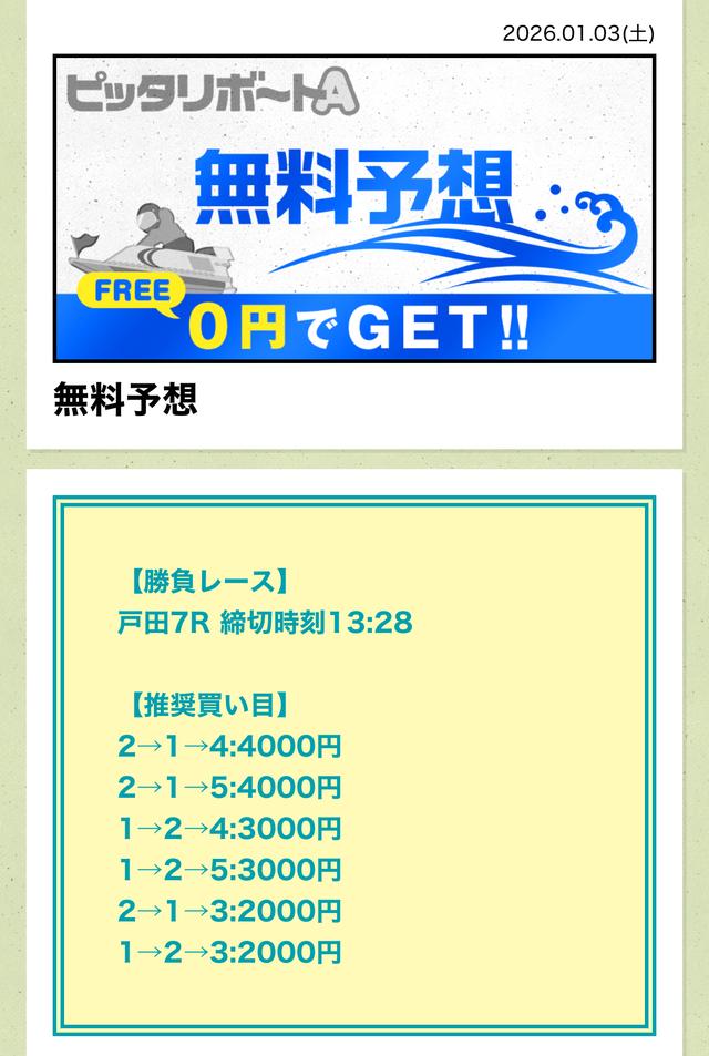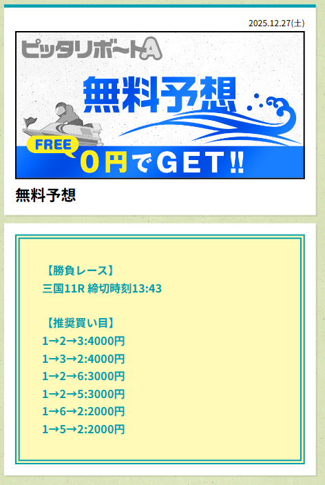 分析とは別で、ピッタリボートAが最も稼いだ無料予想をご紹介しておきます。