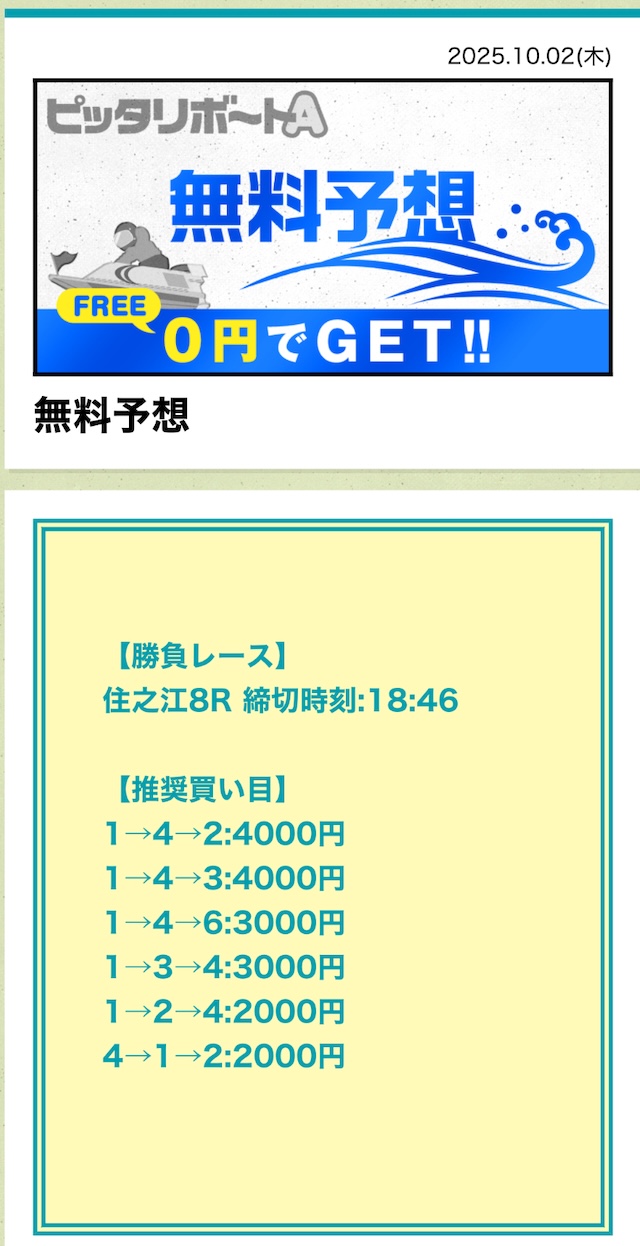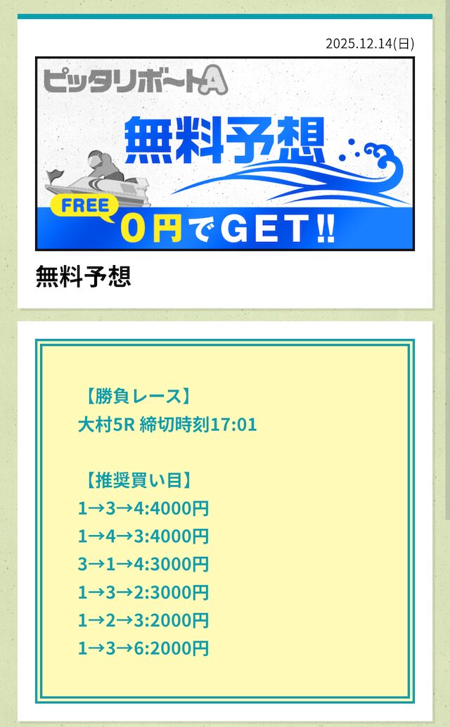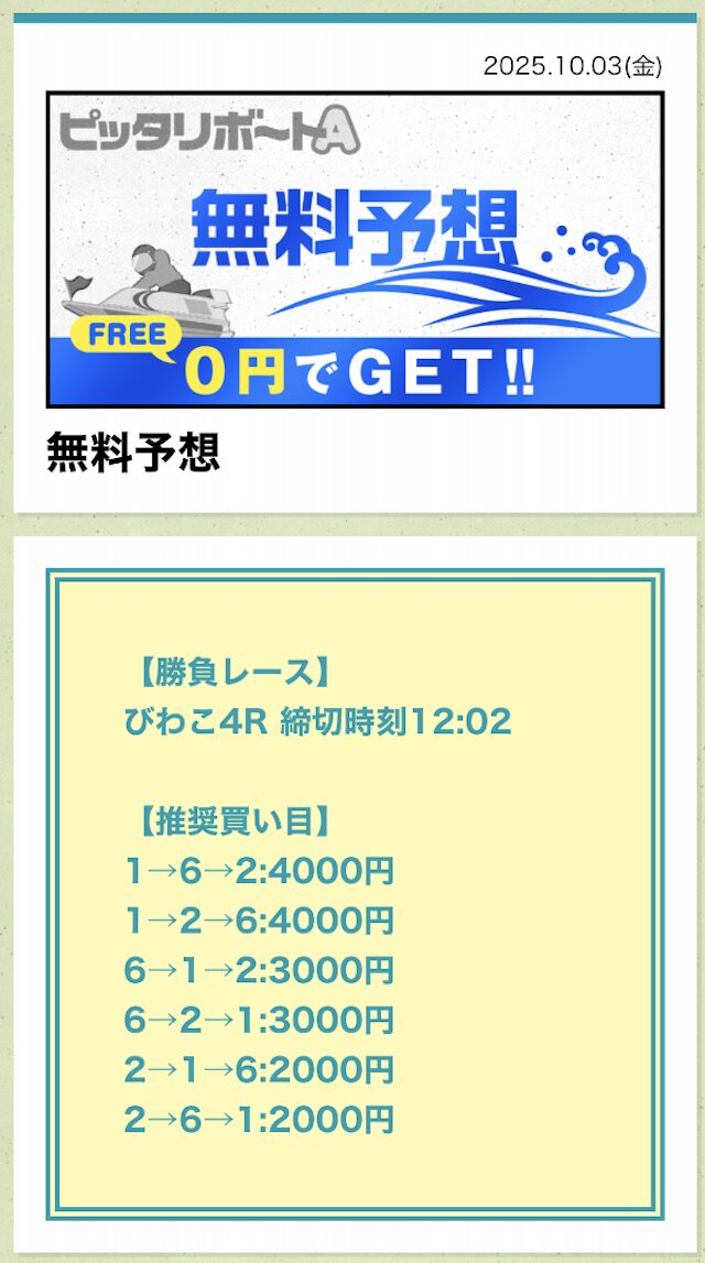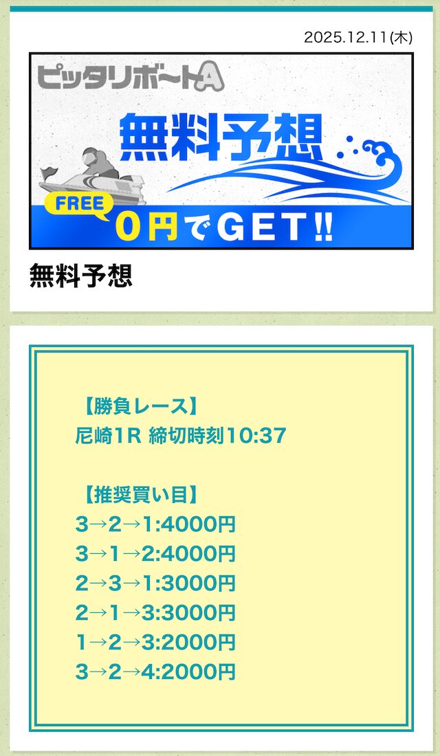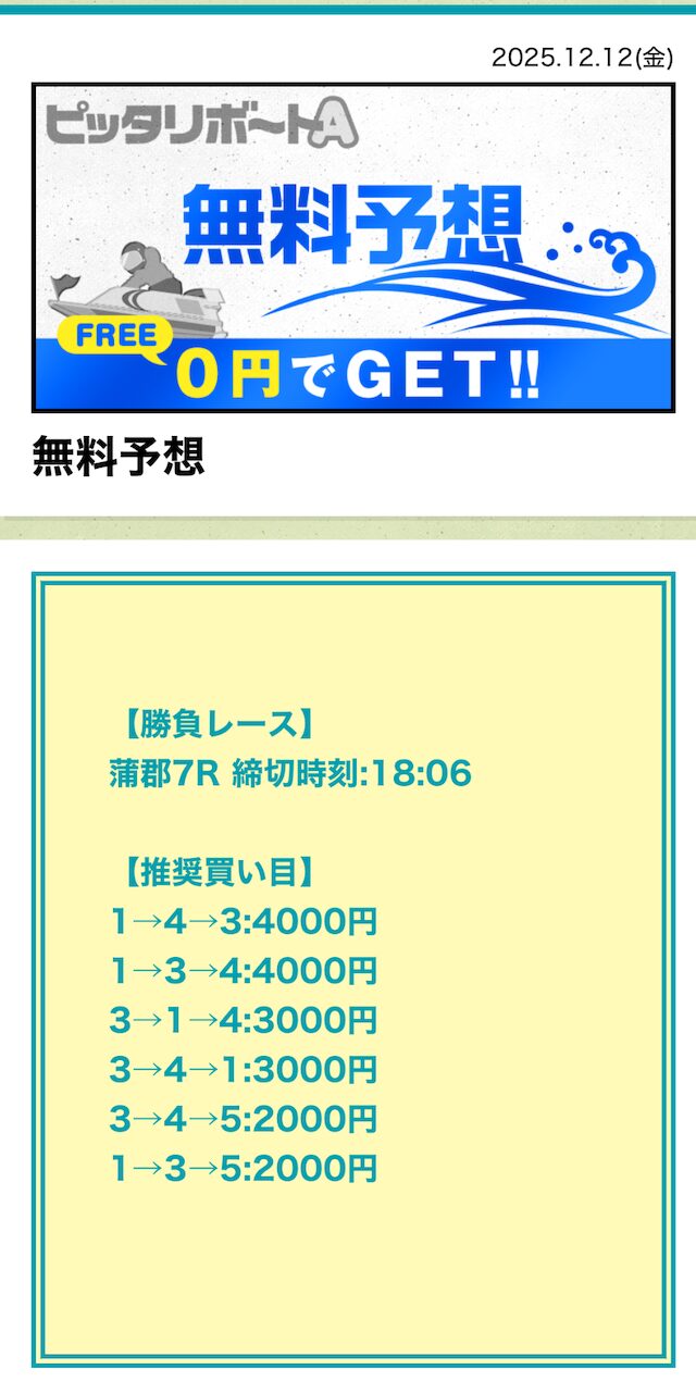ピッタリボートAの成績であれば、無料予想に3回ほど参加すれば購入できるでしょう。