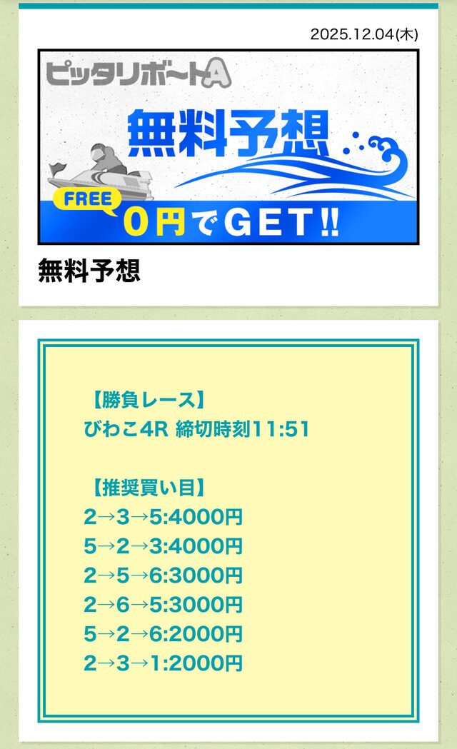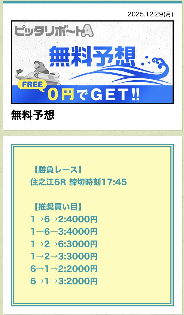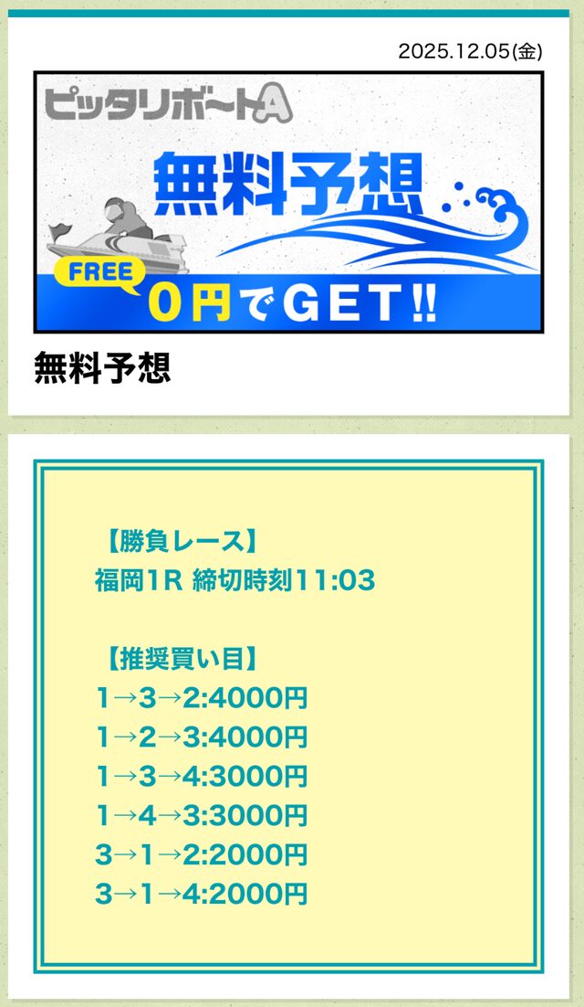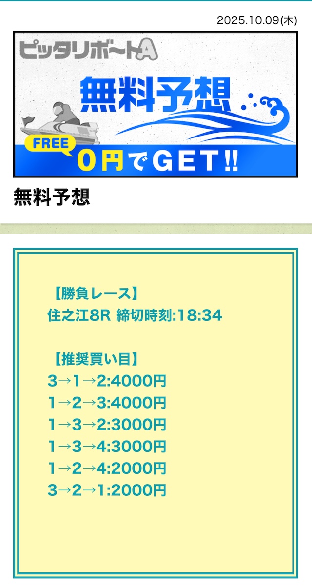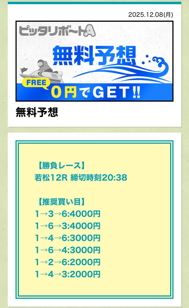 ピッタリボートAの成績であれば、無料予想に3回ほど参加すれば購入できるでしょう。