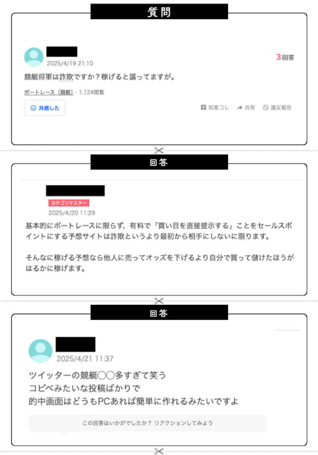 大手知識検索サイト「Yahoo知恵袋」では競艇将軍に対する以下のような投稿がなされています。