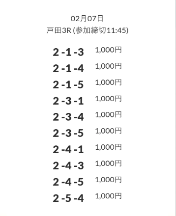 | 2月7日 | 戸田3R | 三連単 | 10点 | 20,500円 |