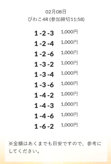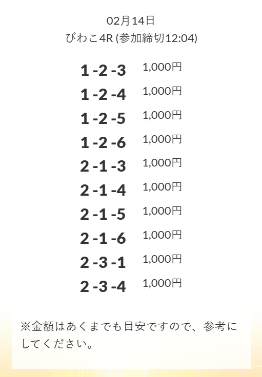 | 2月14日 | びわこ4R | 三連単 | 10点 | 78,500円 |