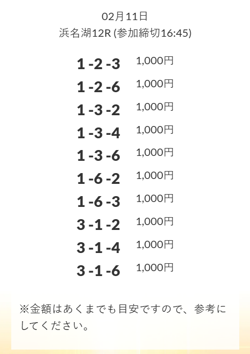 | 2月11日 | 浜名湖12R | 三連単 | 10点 | 18,600円 |