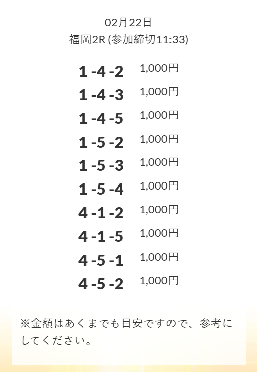 | 2月22日 | 福岡2R | 三連単 | 10点 | 11,400円 |