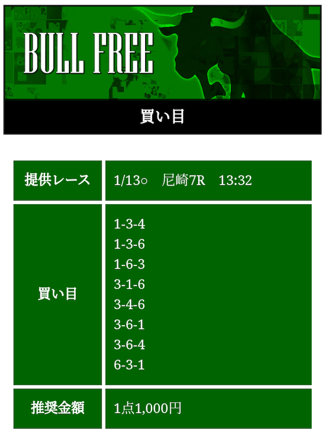 | 1月16日 | 三国11R | 三連単 | 6点 | 13,800円 |