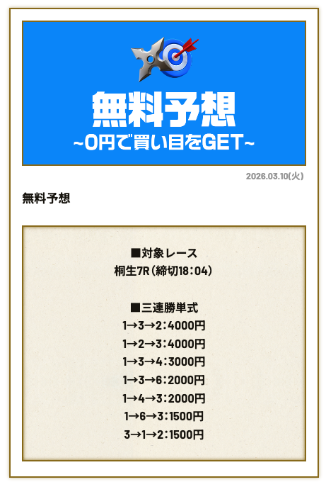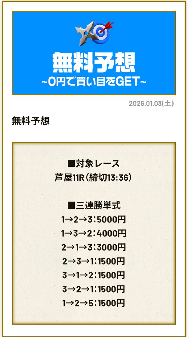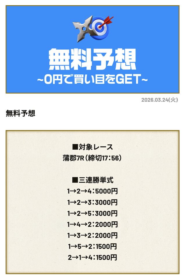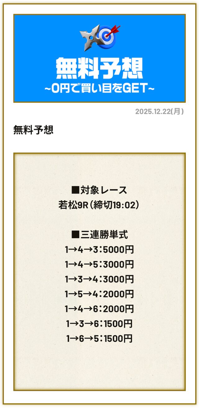 50万・100万円を狙うのであれば、一攫千金が期待できる有料予想です。