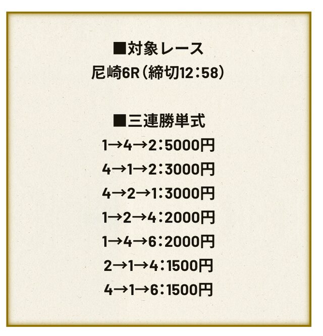 ただ、気になるのは6号艇を3着に据えた買い目に最も厚く資金を配分している点。