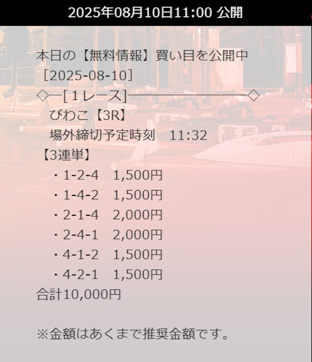 8月10日 | びわこ3R | 三連単 | 6点 | 12,750円 |