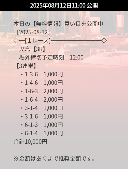 8月12日 | 児島3R | 三連単 | 8点 | 18,200円 |