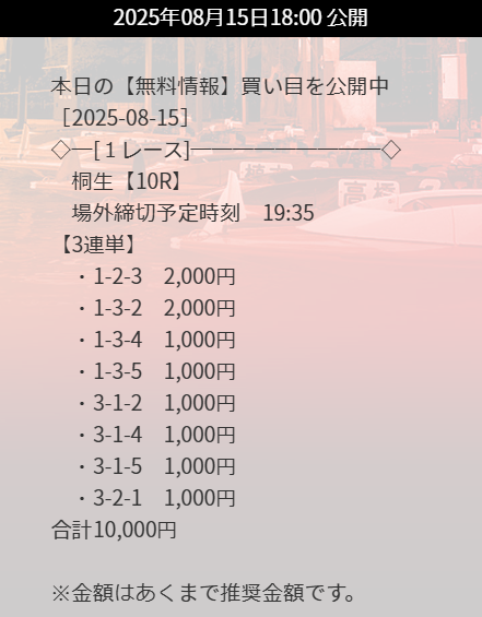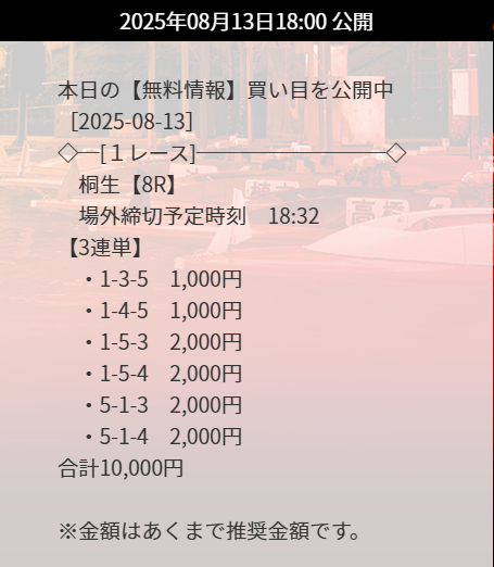 8月15日 | 桐生10R | 三連単 | 8点 | 14,600円 |