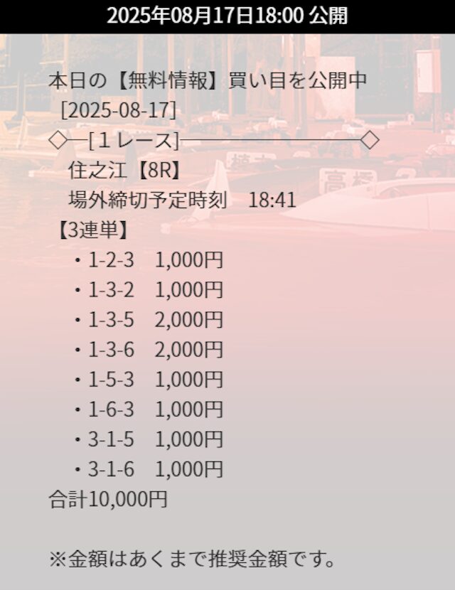8月17日 | 住之江8R | 三連単 | 8点 | 21,100円 |