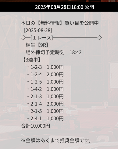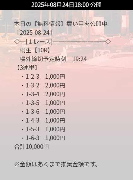 8月28日 | 桐生9R | 三連単 | 8点 | 0円 |