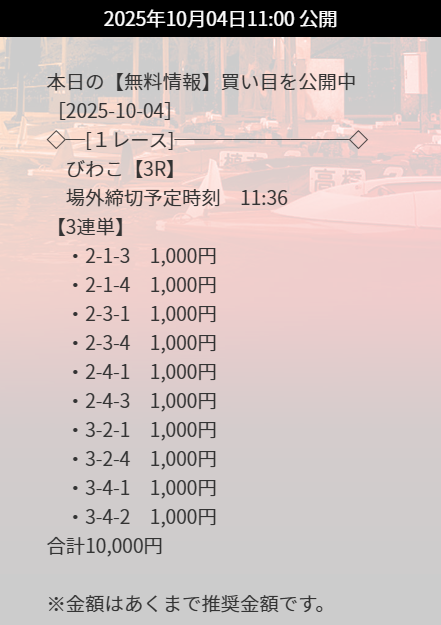 | 10月4日 | びわこ3R | 三連単 | 10点 | 21,400円 |