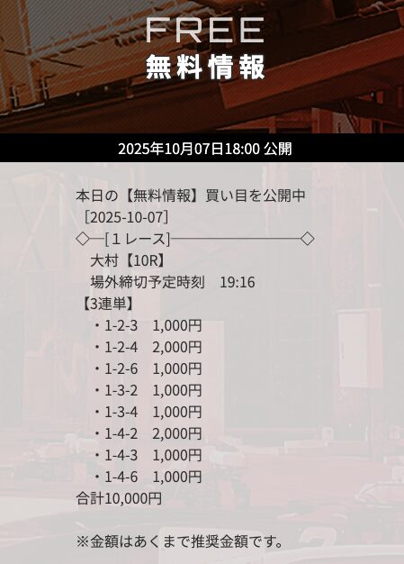 | 10月7日 | 大村10R | 三連単 | 8点 | 22,300円 |