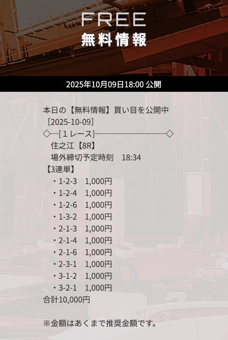 | 10月9日 | 住之江8R | 三連単 | 10点 | 54,100円 |