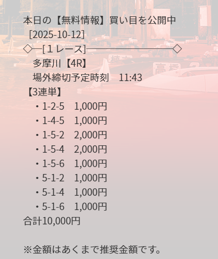 | 10月12日 | 多摩川4R | 三連単 | 8点 | 22,700円 |