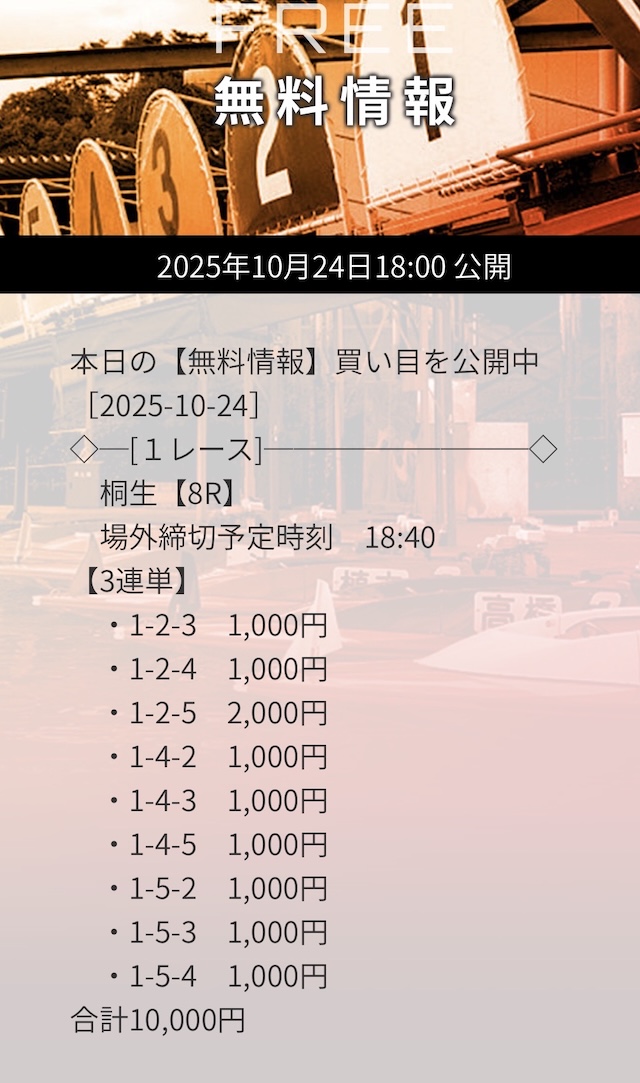| 10月24日 | 桐生8R | 三連単 | 9点 | 18,100円 |