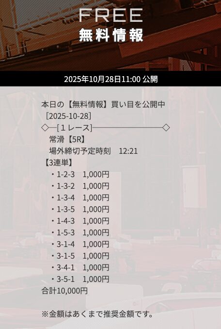 | 10月28日 | 常滑5R | 三連単 | 10点 | 10,000円 |