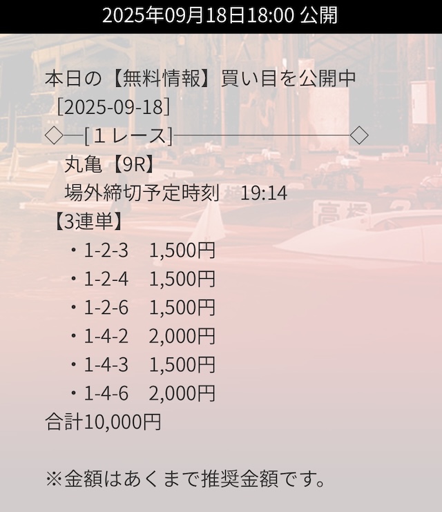 | 9月18日 | 丸亀9R | 三連単 | 6点 | 20,400円 |