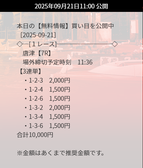| 9月21日 | 唐津7R | 三連単 | 6点 | 17,250円 |