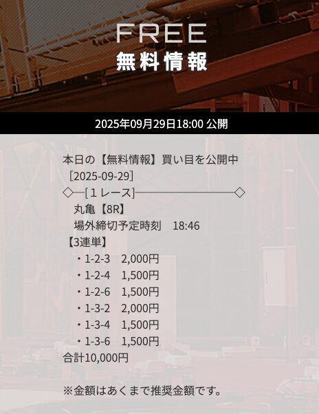 | 9月29日 | 丸亀8R | 三連単 | 6点 | 15,200円 |