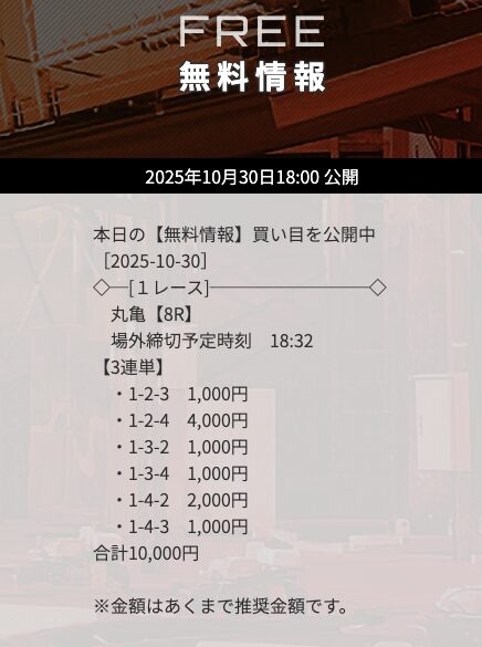 | 10月30日 | 丸亀8R | 三連単 | 6点 | 38,800円 |