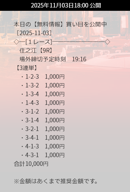 | 11月3日 | 住之江9R | 三連単 | 10点 | 35,500円 |