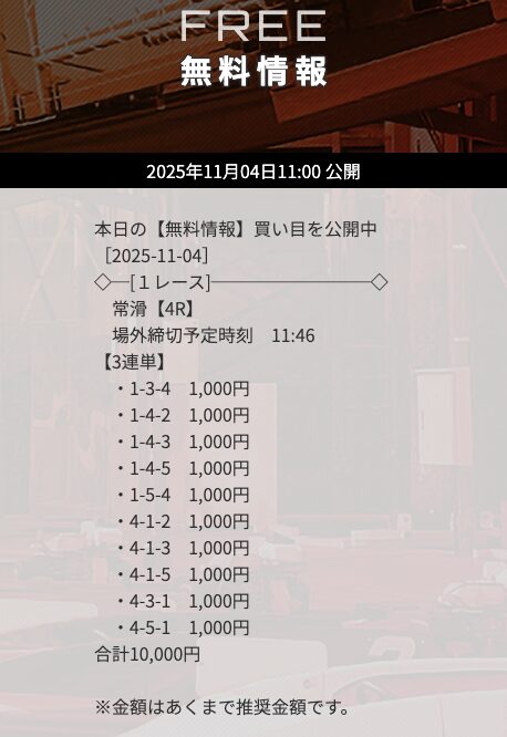 | 11月4日 | 常滑4R | 三連単 | 10点 | 26,400円 |