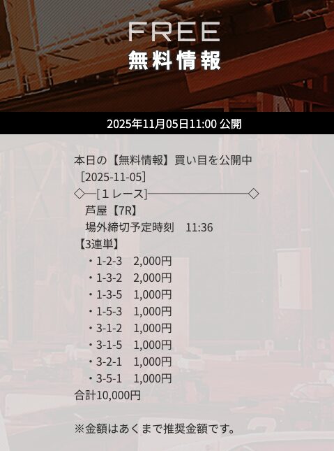 | 11月5日 | 芦屋7R | 三連単 | 8点 | 13,200円 |