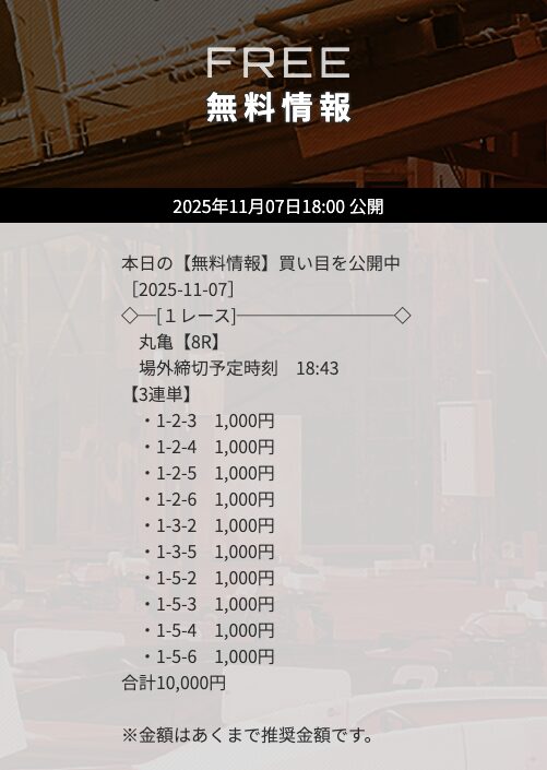 | 11月7日 | 丸亀8R | 三連単 | 10点 | 18,800円 |