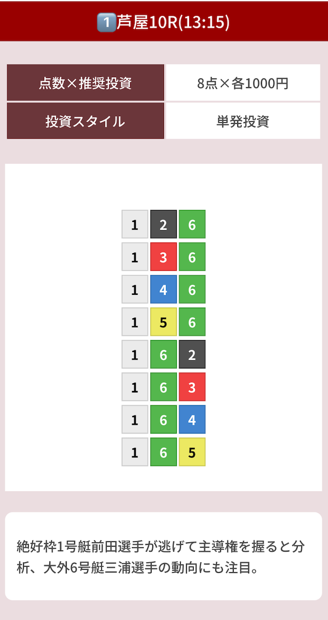 1号艇を頭に2・3・6で流して6点で勝負するのが一般的でしょう。
