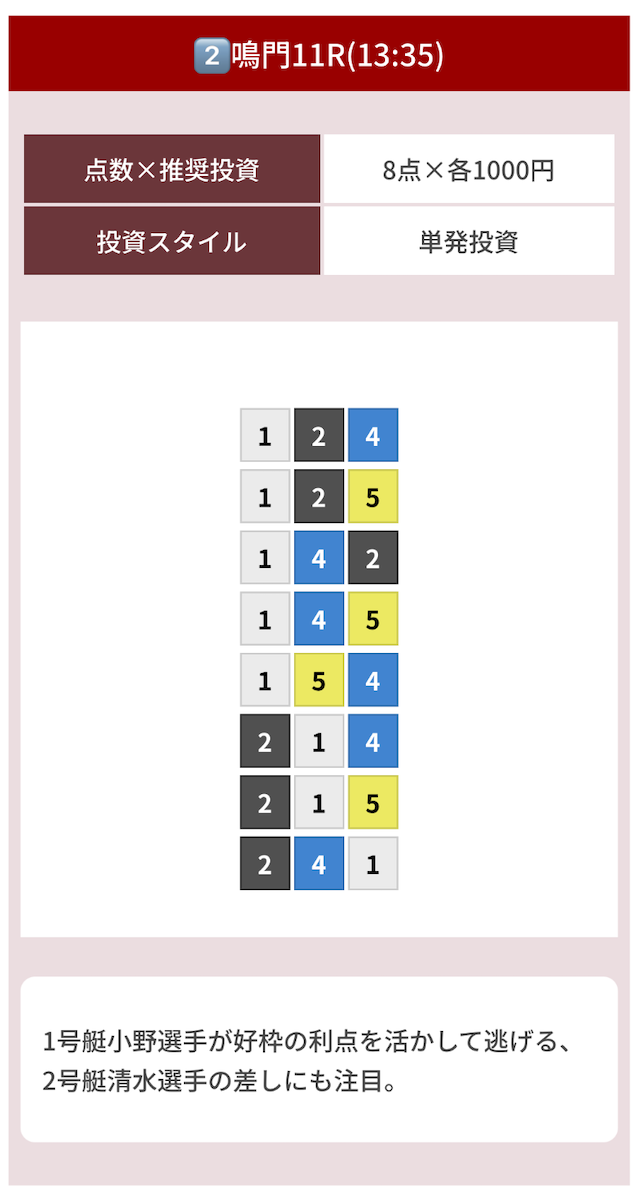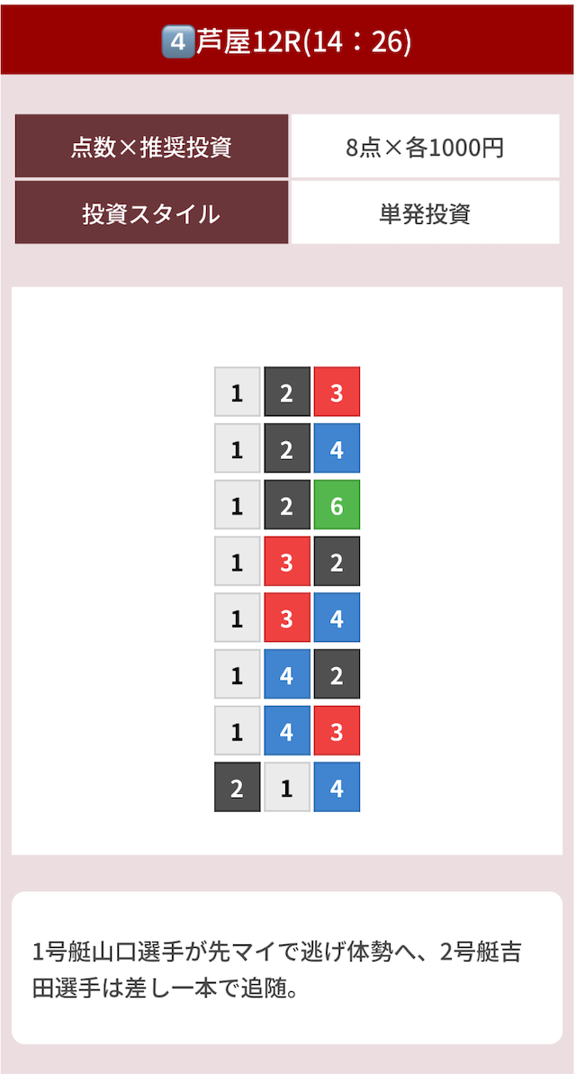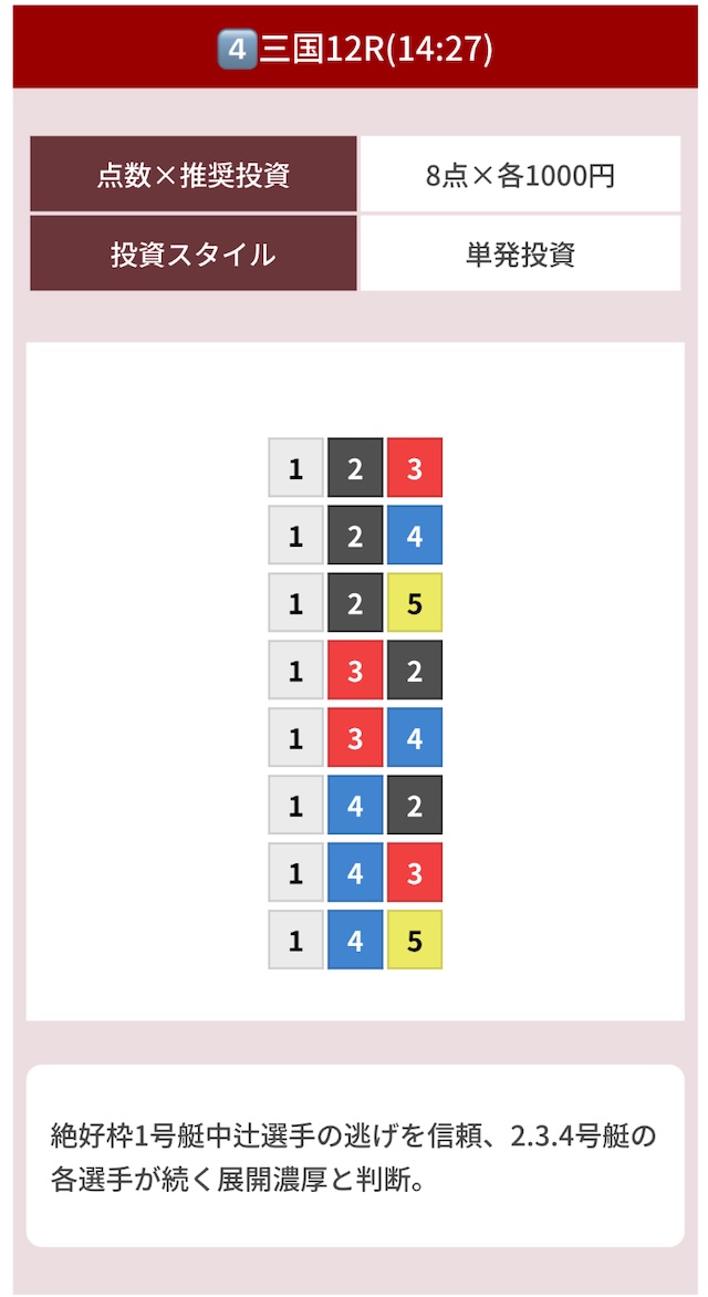 考え方は一緒ですが、2号艇を1着にした予想を2点追加しました。