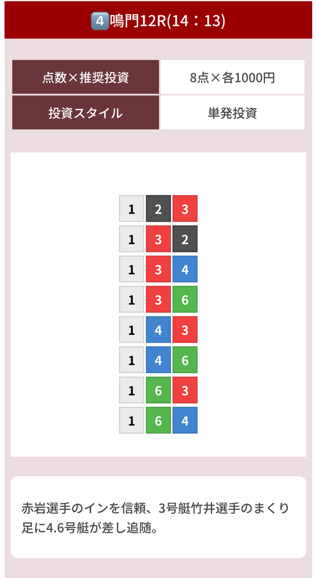 | 8月23日 | 鳴門12R | 三連単 | 8点 | 21,200円 |