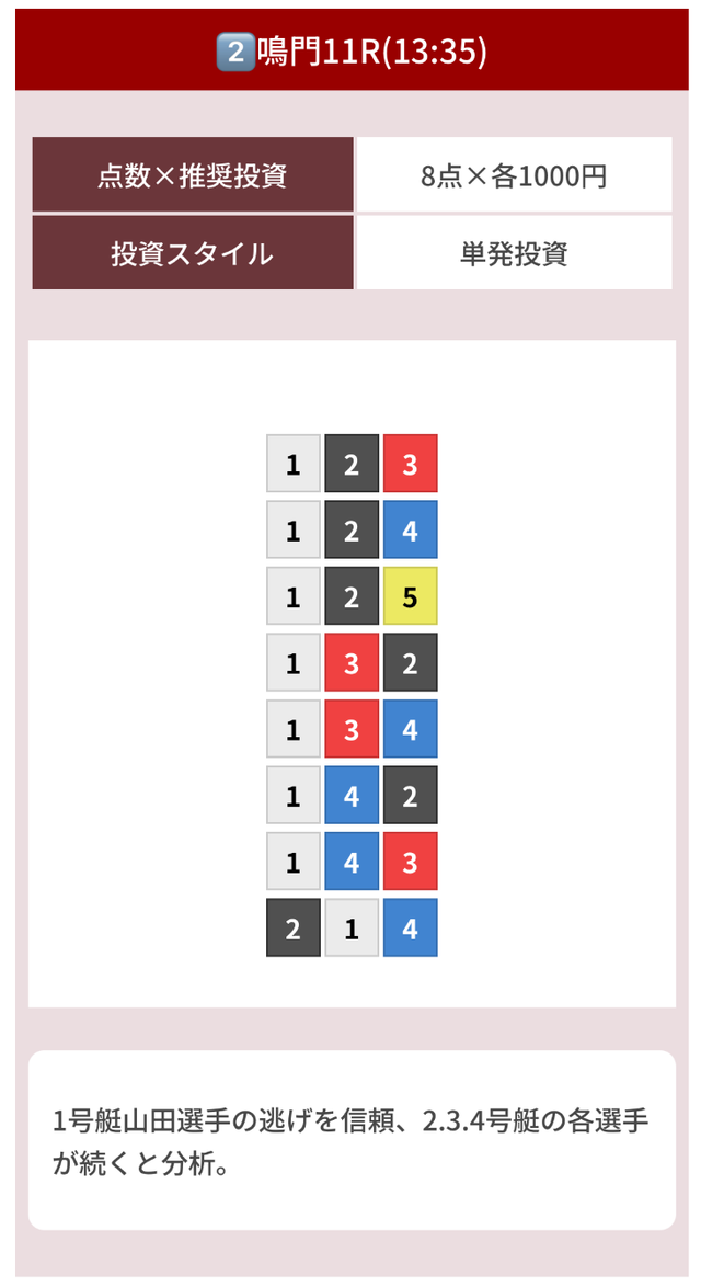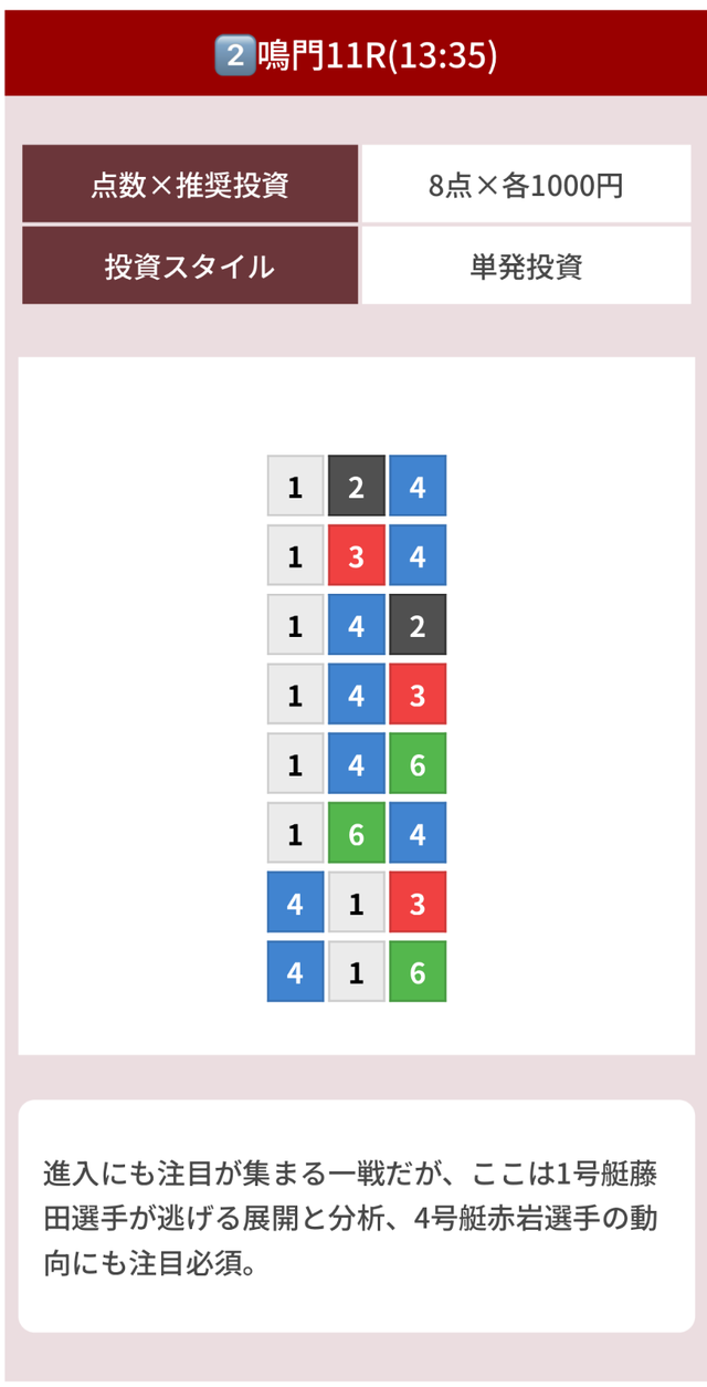 | 11月27日 | 鳴門11R | 三連単 | 8点 | 48,500円 |