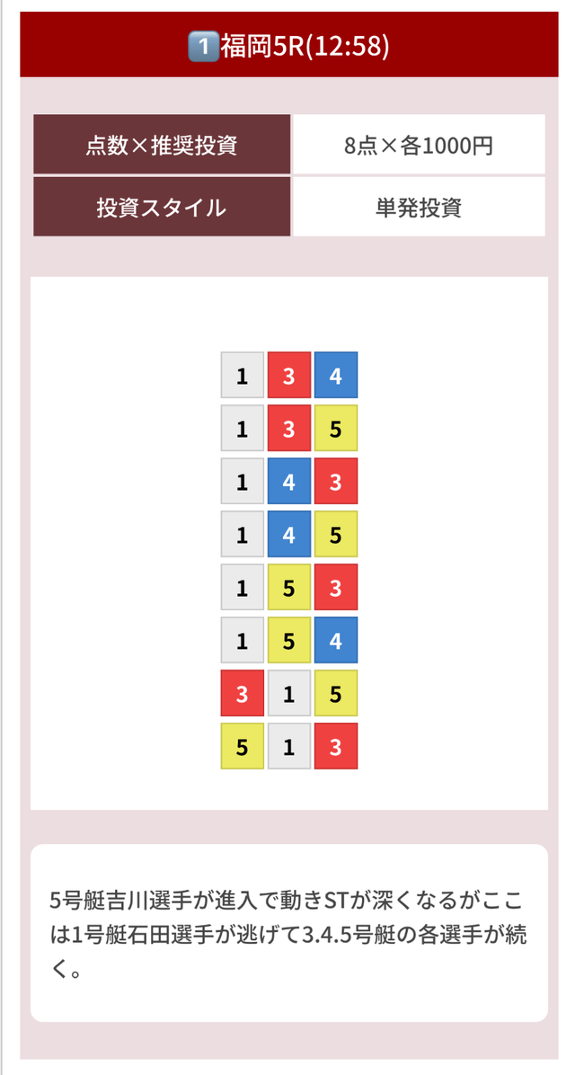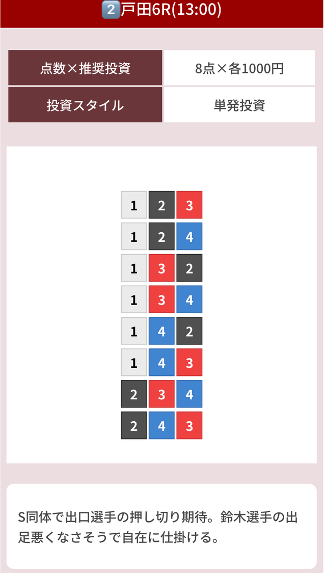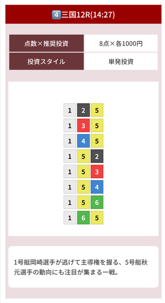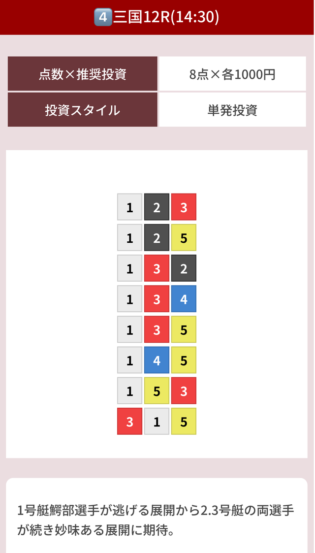 | 12月12日 | 三国12R | 三連単 | 8点 | 16,000円 |