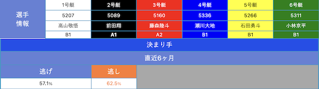 例えば画像のレースでは、2号艇のみA1級の選手ですが逃がし率が62.5%とかなり高くなっています。