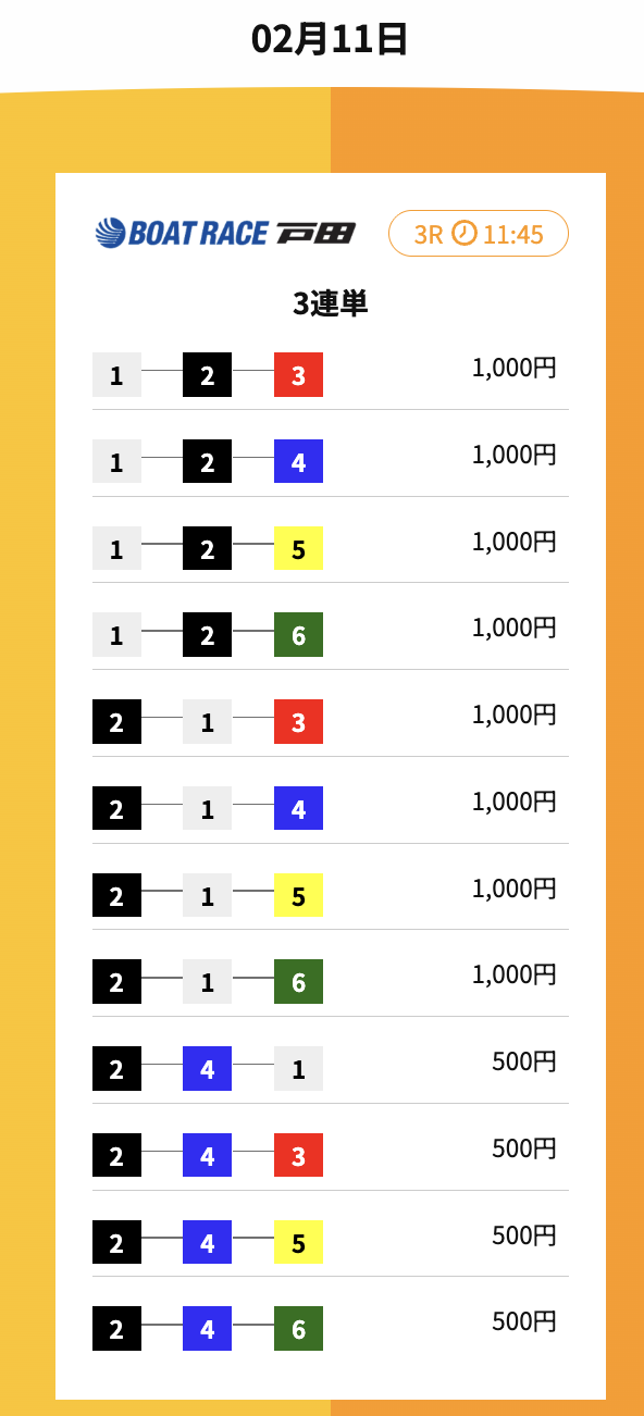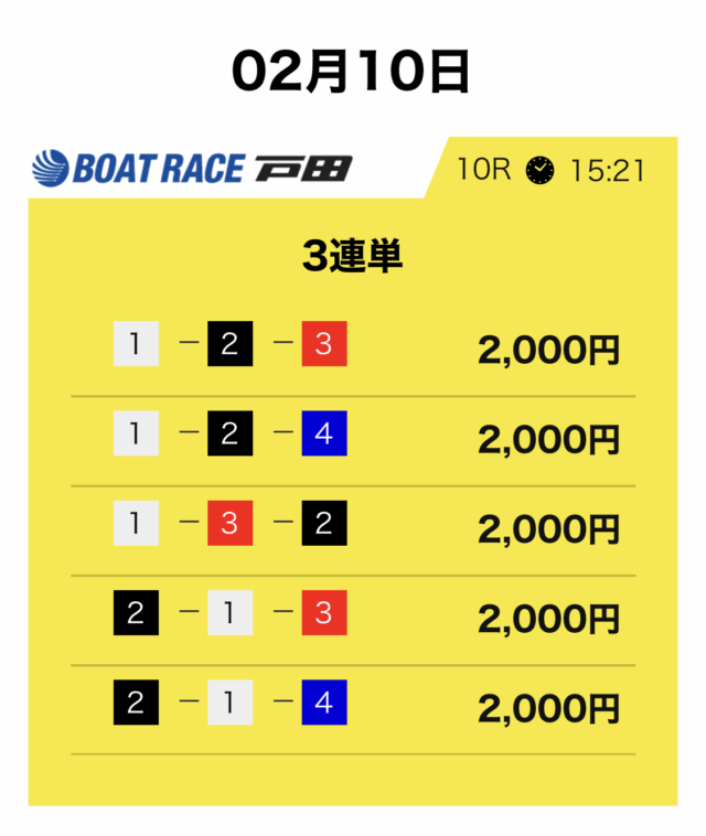 11/25 戸田競艇場 6R10,000円143,000円獲得!- 賭式3連単