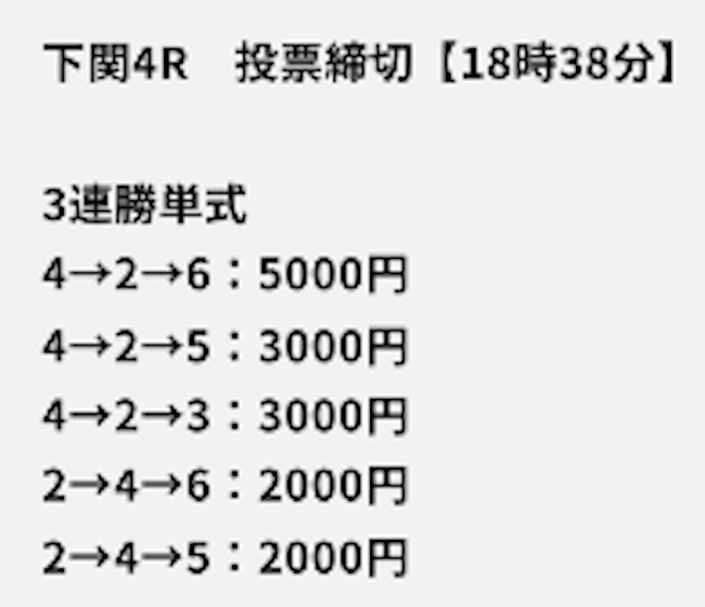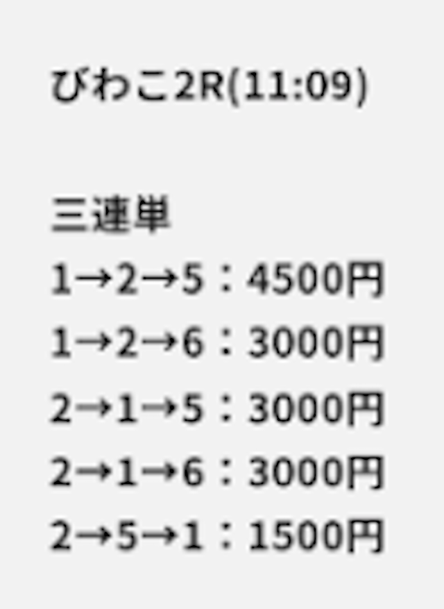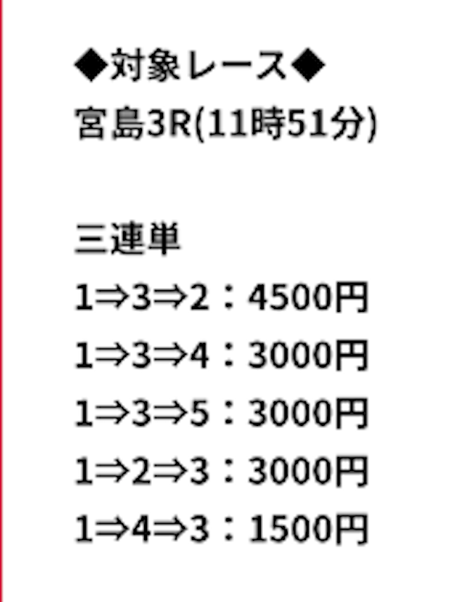 エメラルド投資金額 18,000円 15,000円 15,000円 情報料金 10,000円 20,800円 24,800円 戦績 1戦1勝0敗 1戦1勝0敗 1戦1勝0敗 的中率 100% 100% 100% 回収率 228.2% 1356.2% 2257.6% 払戻 63,900円 485,520円 898,560円 収支 +35,900円 +449,720円 +858,760円 -