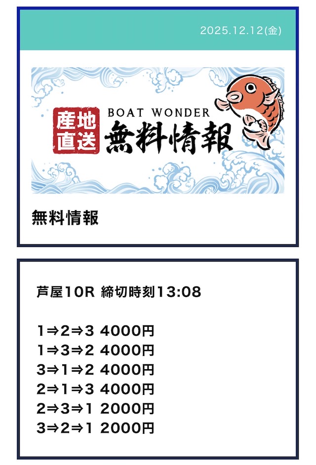 分析とは別で、ボートワンダーが最も稼いだ無料予想をご紹介しておきます。